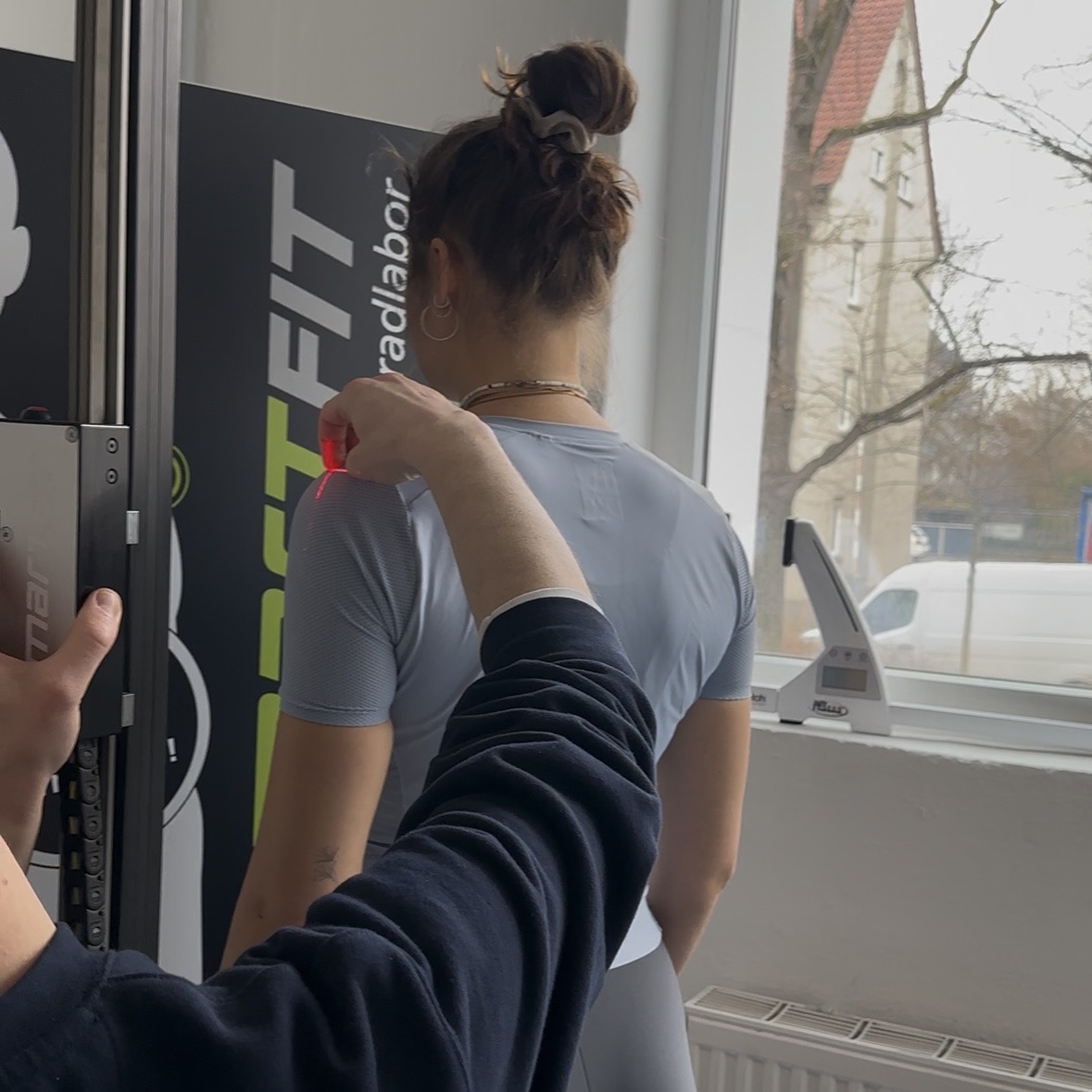 Ein hochpräziser Laser erfasst deine Körpergeometrie millimetergenau. Vermessen werden zentrale anatomische Referenzpunkte wie Sitzhöcker, Hüftknochen und Oberschenkelhals, ergänzt durch Innenbeinlänge und Körpergröße. Parallel analysieren wir deinen Bewegungsablauf in Echtzeit, betrachten gezielt mögliche Problemzonen wie Beinachse, Kniebewegung, Sprunggelenke, Schulterhaltung und Nackenbereich und identifizieren biomechanische Auffälligkeiten. So entsteht die Grundlage für eine exakte, individuell abgestimmte Sitzposition.